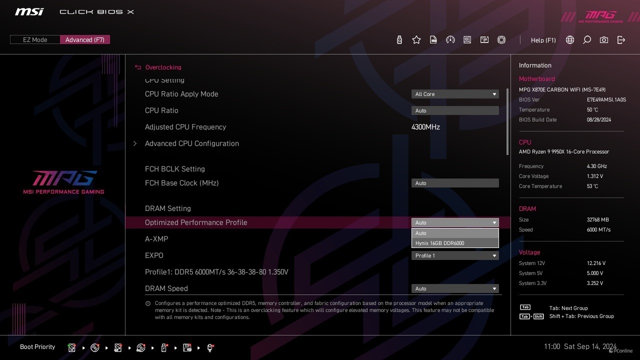 普通的内存测试看完了,我们再看点不一样的。随着锐龙9000系处理器以及AMD 800系主板上市,AMD推出了新的AMD Optimized Performance Profile (OPP)功能,这是专门针对海力士A-die颗粒内存提供的特殊优化,预设了一组DDR5-6000 CL30-38-38-96的设定,比大多数EXPO的预设还要猛!