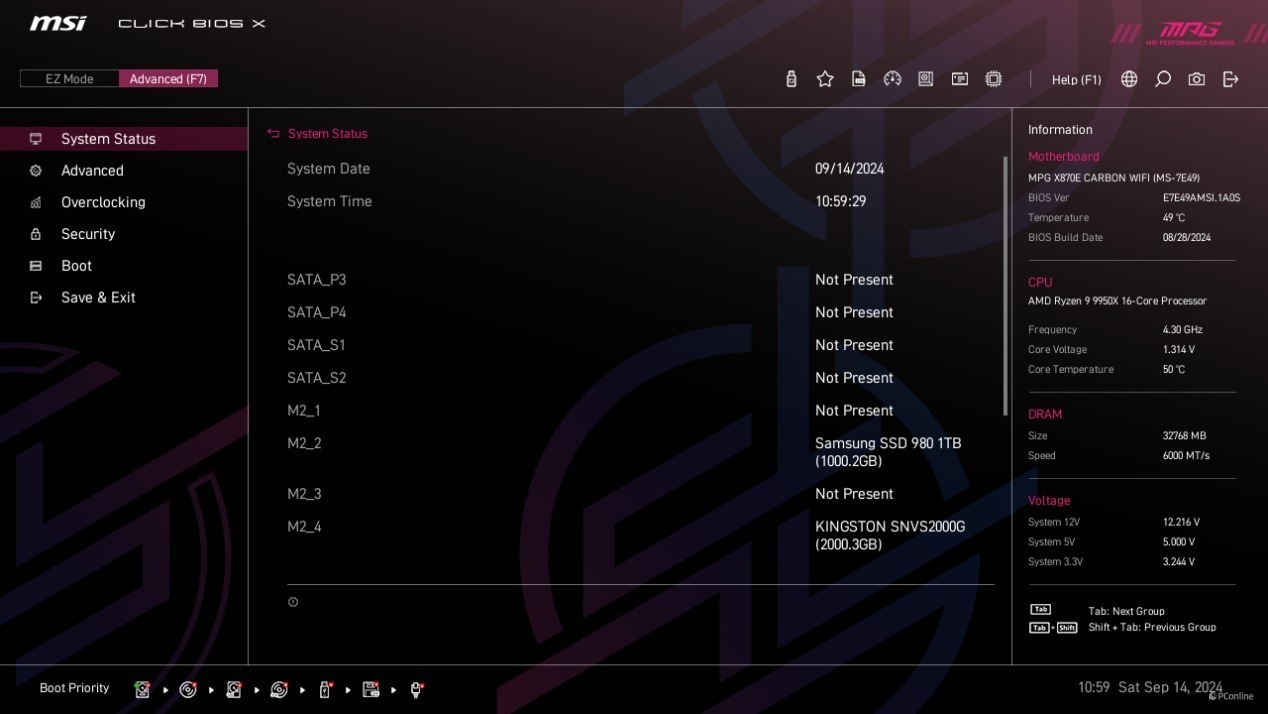 在BIOS里看完硬件参数,这里再介绍一下新BIOS下,高级模式纠结有哪些模块,首先还是System Status,这里可以看到主板的信息,例如哪个M.2接口接入了硬盘,名称是什么,能够随时掌握硬件状态。