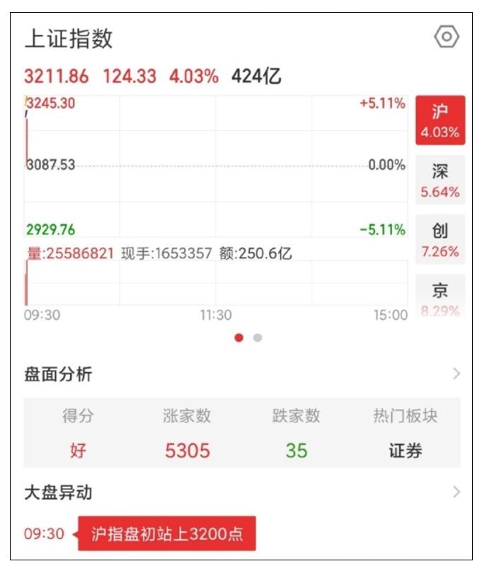 今天(9月30日)上午,A股市场延续近期火爆行情。开盘后35分钟,沪深两市成交额就突破1万亿元。沪指站上3200点,创近一年新高;券商、软件、房地产等板块齐发力,其中房地产板块掀涨停潮;全市场股票ETF持续飙升,36只ETF涨幅一度超10%。