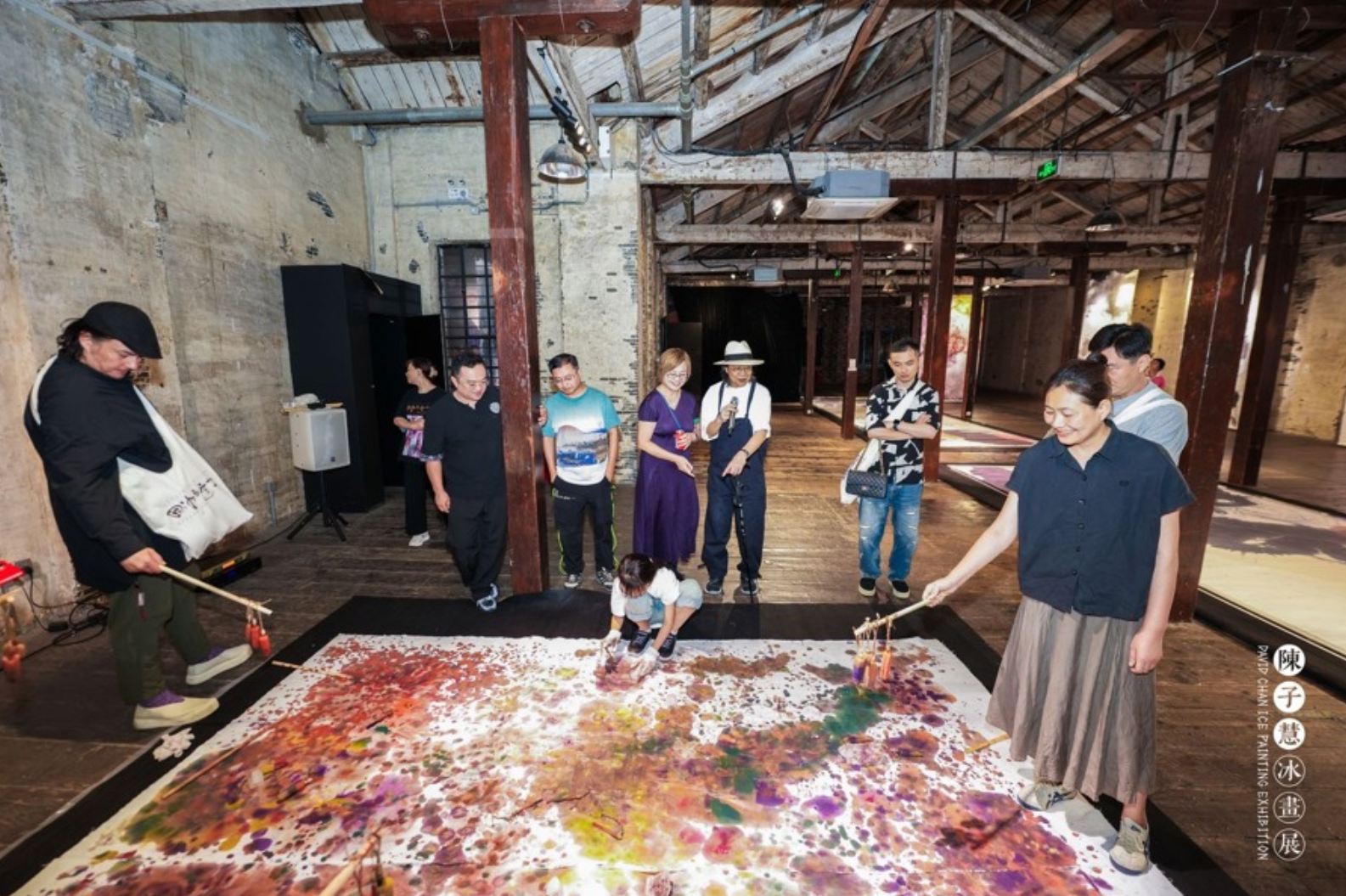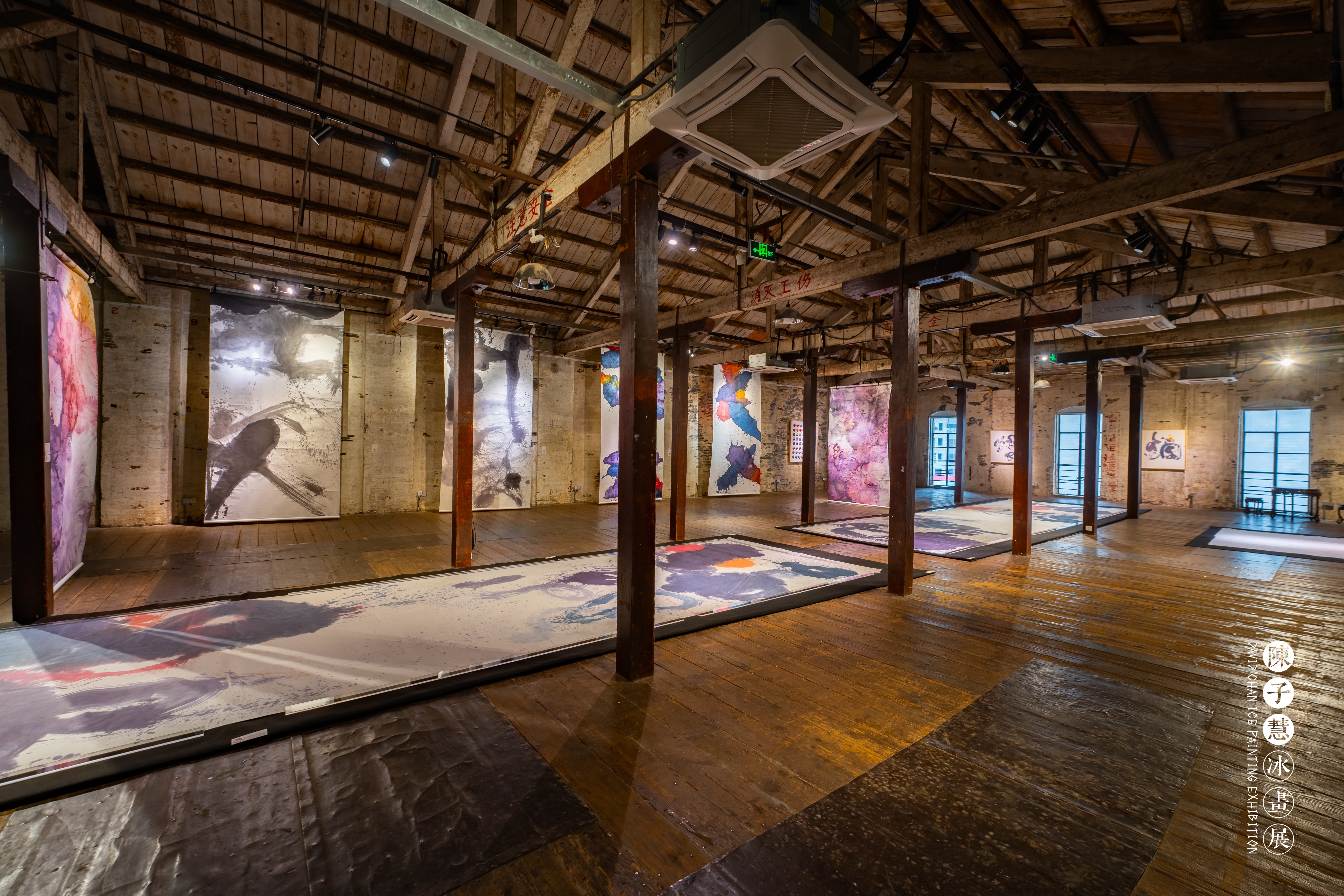 文物建筑与全新艺术之间,张力无限。这是陈子慧的观点。冰画展陈于八号桥艺术空间——1908粮仓,这幢历史建筑始建于1908年,曾为中国通商银行第二仓库、杜月笙私家粮仓。空间汇集“仓、河、桥、砖、木”元素,良好的艺术氛围和独特的空间结构让它成为苏州河畔一道靓丽风景。沿着楼梯上至二、三楼,便能看到色彩清透的冰画悬挂于充满历史气息的空间内,这“点点滴滴”的彩色也更具意蕴。“从物理上而言,1908粮仓是木结构为主的建筑,冰画所用的宣纸也来自木头。两者组合在一起毫不违和。”