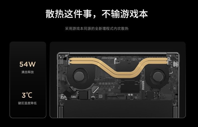 YOGA Pro 14锐龙 AI 元启版拥有增程式内吹,官方称其能实现高达54W满血性能释放,键盘区域温度降低 3°C。