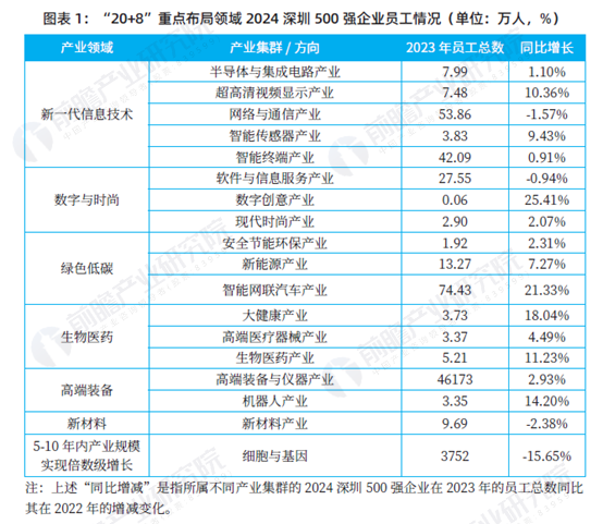 2024 深圳500 强企业“20+8”重点布局领域不同产业的员工增长情况存在显著差异。一些新兴产业如数字创意产业和智能网联汽车产业显示出强劲的增长势头,而一些传统产业如激光与增材制造产业和网络与通信产业则面临员工减少的挑战。