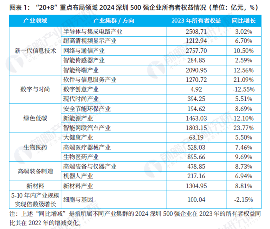整体来看,2024 深圳500 强中“20+8”产业集群企业在多个重点领域实现了所有者权益的增长,特别是在新一代信息技术、绿色低碳和高端制造领域的表现尤为突出。