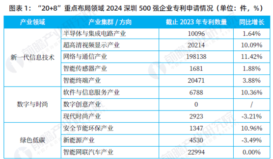 2024深圳500强企业中“20+8”产业集群中网络与通信产业、超高清视频显示产业和软件与信息服务产业在专利数量和增长率上实力较强,显示出强劲的创新驱动能力。