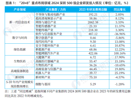 在2024 深圳500 强企业“20+8”重点布局领域研发投入中,智能网联汽车产业异军突起,在研发投入上实现了惊人的增长,同比增幅高达100.16%,远超其他领域,显示强劲发展势头和巨大潜力。