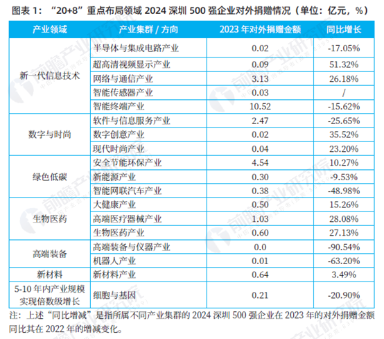 2024 深圳500 强中“20+8”重点布局领域的对外捐赠情况显示出一些产业在社会责任方面投入增加,而部分产业则出现下降。特别是网络与通信产业和高端医疗器械产业在捐赠金额和增长率上表现较为突出。其中网络与通信产业捐赠金额较高,为3.13 亿元,同比增长26.18%;高端医疗器械产业捐赠金额为1.03 亿元,同比增长28.08%。而智能终端产业、软件与信息服务产业尽管金额较大,但增长率下降明显。