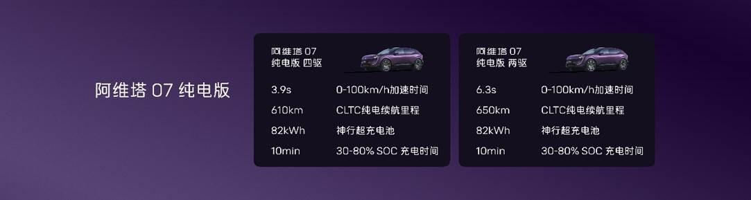 动力上,阿维塔07纯电版拥有搭载宁德时代提供的82.16kWh神行超充电池,续航高至650km;采用了自主研发的全新一代电驱系统,前异步电机配合后碳化硅永磁同步电机,零百加速低至3.9秒,百公里刹停34.5m。