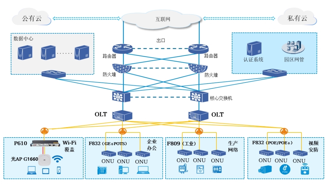 针对园区生产网,采用双上行工业级ONU F809接入生产机台,低时延PON技术将生产网端到端时延降低了50%,跨OLT的手拉手保护组网,实现了99.999%网络可靠性。