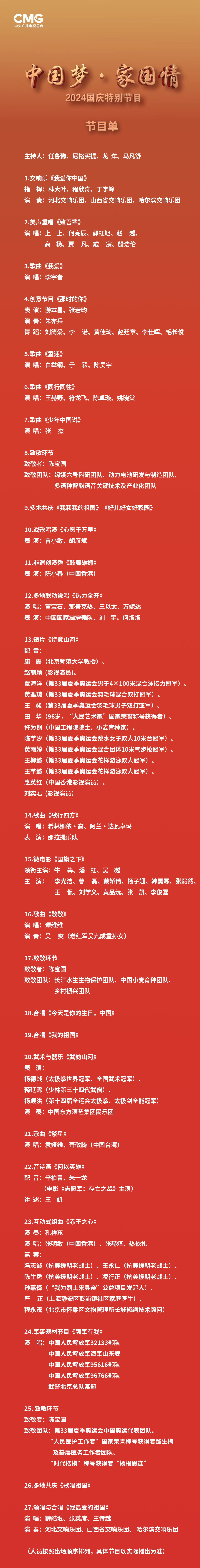 征途如虹,风正扬帆!中央广播电视总台《中国梦·家国情——2024国庆特别节目》将于今晚8点档,在央视综合频道(CCTV-1)、综艺频道(CCTV-3)、音乐频道(CCTV-15),央视新闻、央视频、央视网、央视文艺以及音乐之声、经典音乐广播、文艺之声等多平台播出。