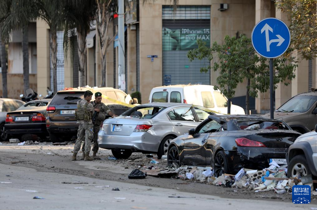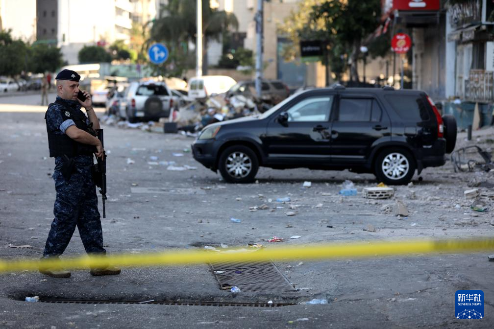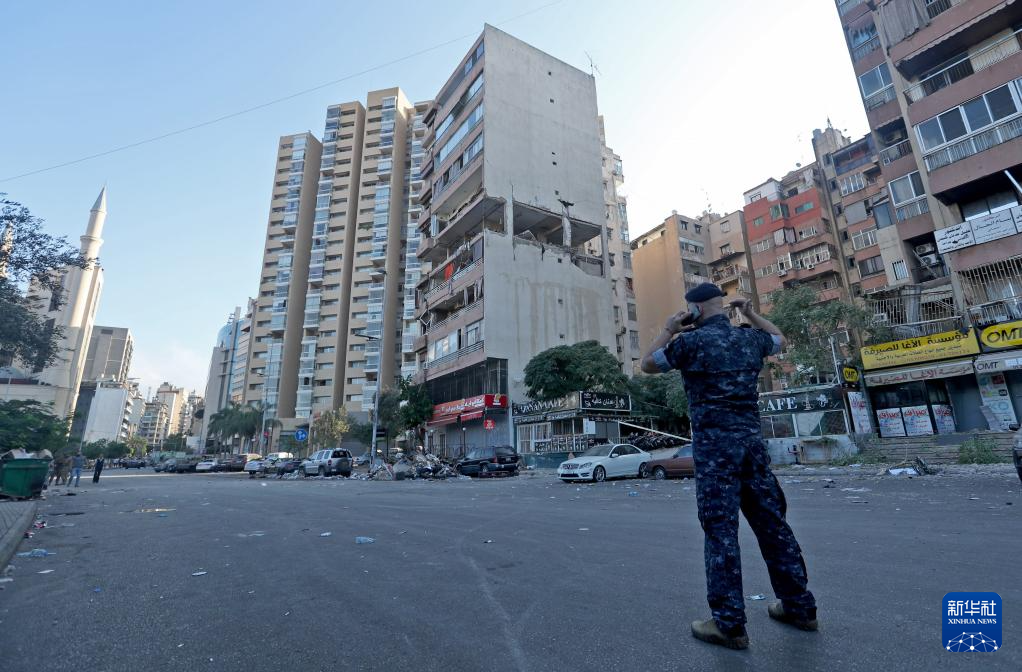 9月30日,安全人员在黎巴嫩首都贝鲁特城区遭以色列空袭的居民楼附近警戒。