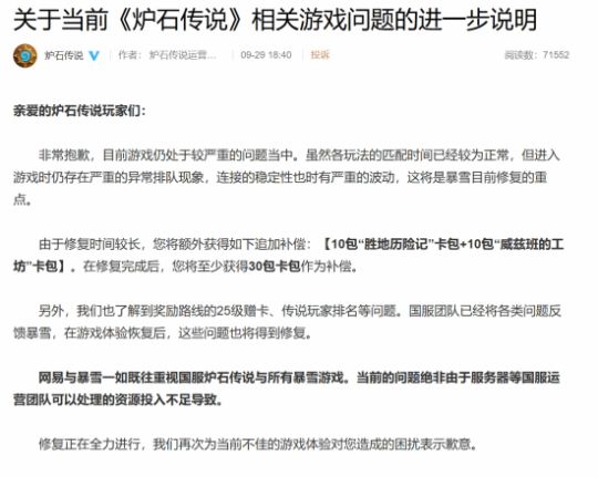 2024年9月29日,《炉石传说》国服官方发布了一篇文章,针对当前游戏中存在的严重问题进行了进一步说明。公告中,官方对玩家们表达了歉意,并详细说明了目前的修复进展及后续补偿措施。