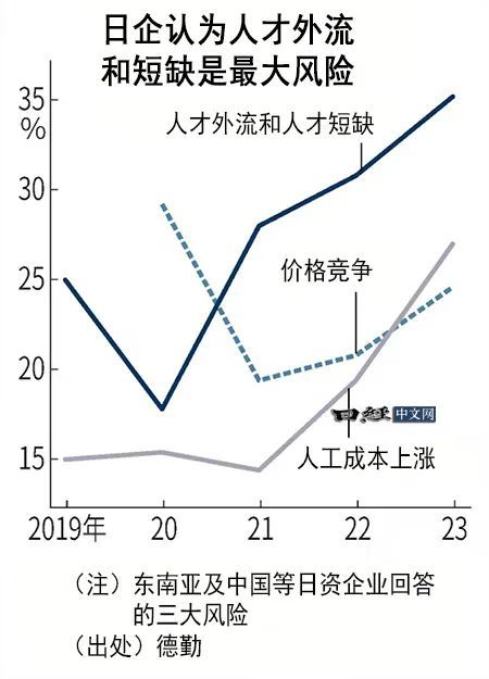 德勤的数据显示,东南亚等地区的日资企业认为的最大风险因素是“人才外流与人才短缺”。2023年,35%的受访企业做出这样的回答,比2019年增加了10个百分点。