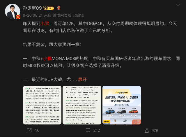 微博KOC孙少军率先在经销商门店处获得消息,他最近在直播中提到小鹏目前的订单量走势非常不错,上周新增一万两千单订单,更重要的是,G6破了四千单订单。
