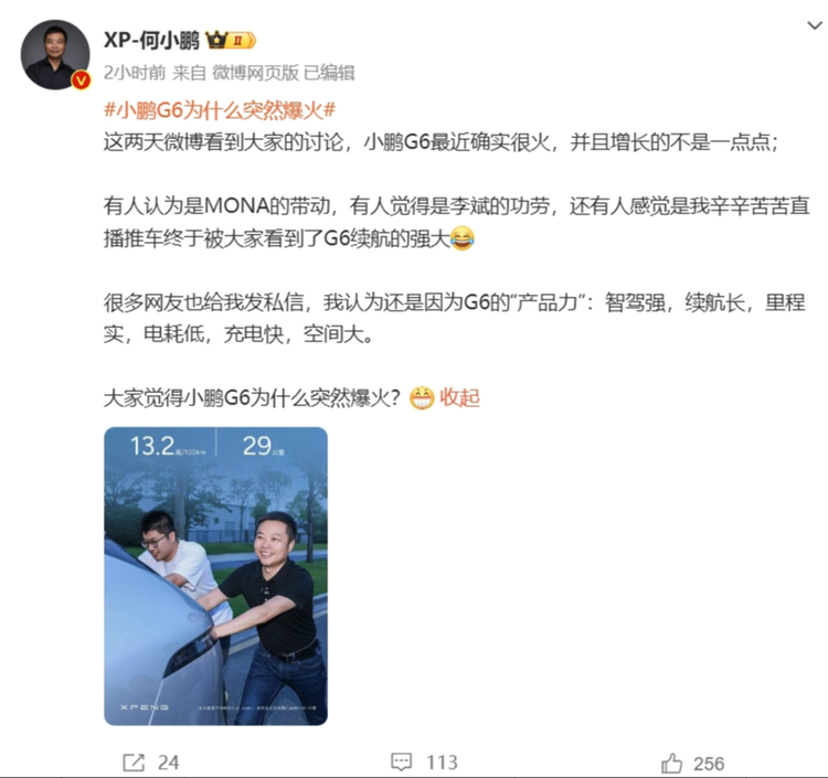 小鹏汽车董事长何小鹏,在微博上快速做出了回应,在“小鹏G6为什么突然爆火”的词条下,他表示:有人认为是MONA的带动,有人觉得是李斌的功劳,还有人感觉是我辛辛苦苦直播推车终于被大家看到了G6续航的强大。我认为还是因为G6的“产品力”:智驾强,续航长,里程实,电耗低,充电快,空间大。