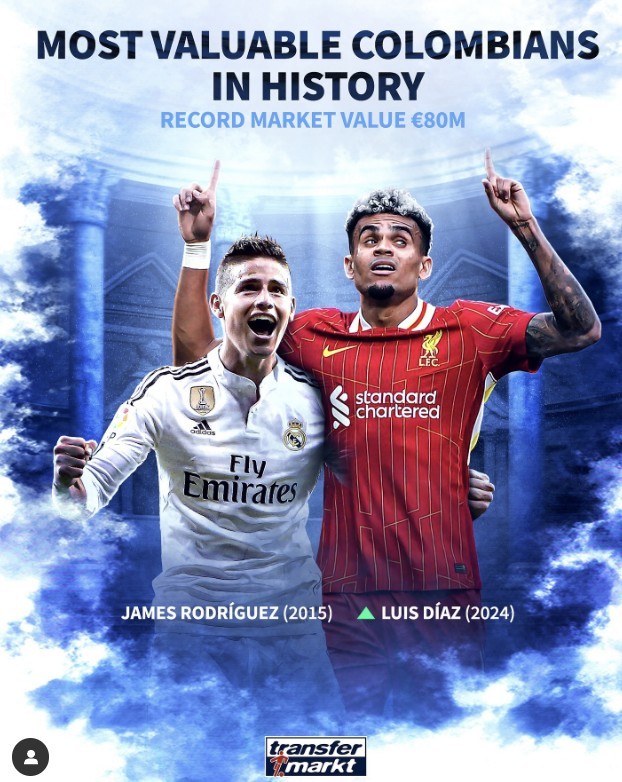 目前,路易斯-迪亚斯的身价上涨至8000万欧元,这意味着他也追平了J罗在2015年为皇马效力时所创下的哥伦比亚球员的历史最高身价。