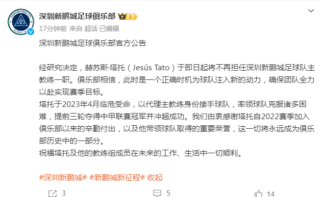 北京时间10月2日,深圳新鹏城足球俱乐部发布公告:经研究决定,赫苏斯·塔托(Jesús Tato)于即日起将不再担任深圳新鹏城足球队主教练一职。俱乐部相信,此时是一个正确时机为球队注入新的动力,确保团队全力以赴实现赛季目标。