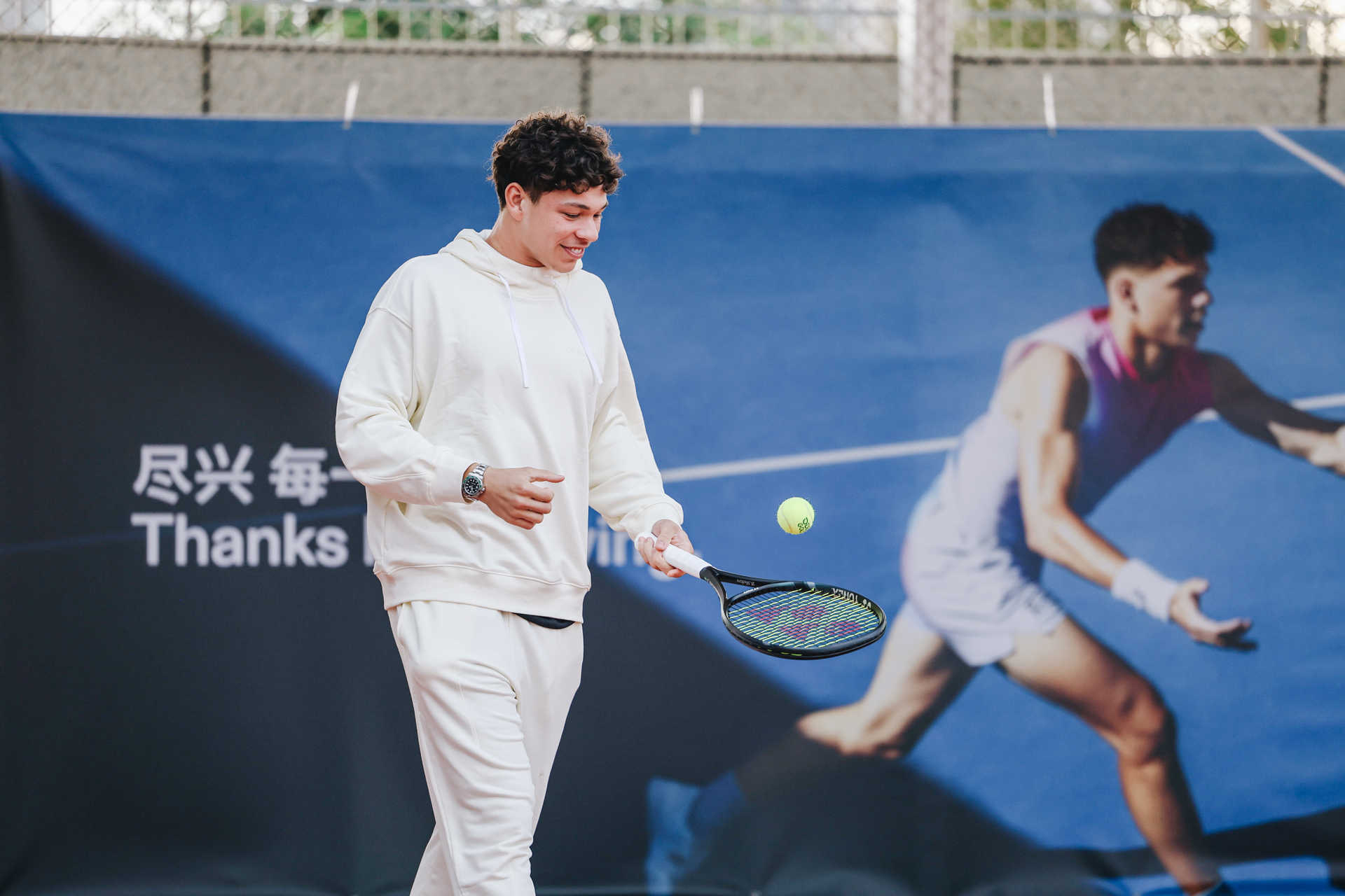 谢尔顿还与上海Keystone绮梦网球俱乐部的球迷进行了一场特殊的挑战赛,双方展开精彩的网球切磋。谢尔顿在网球场上一如既往地尽兴投入,展现了精湛的球技,而年轻网球爱好者们也拿出了不俗实力,积极与谢尔顿比拼。