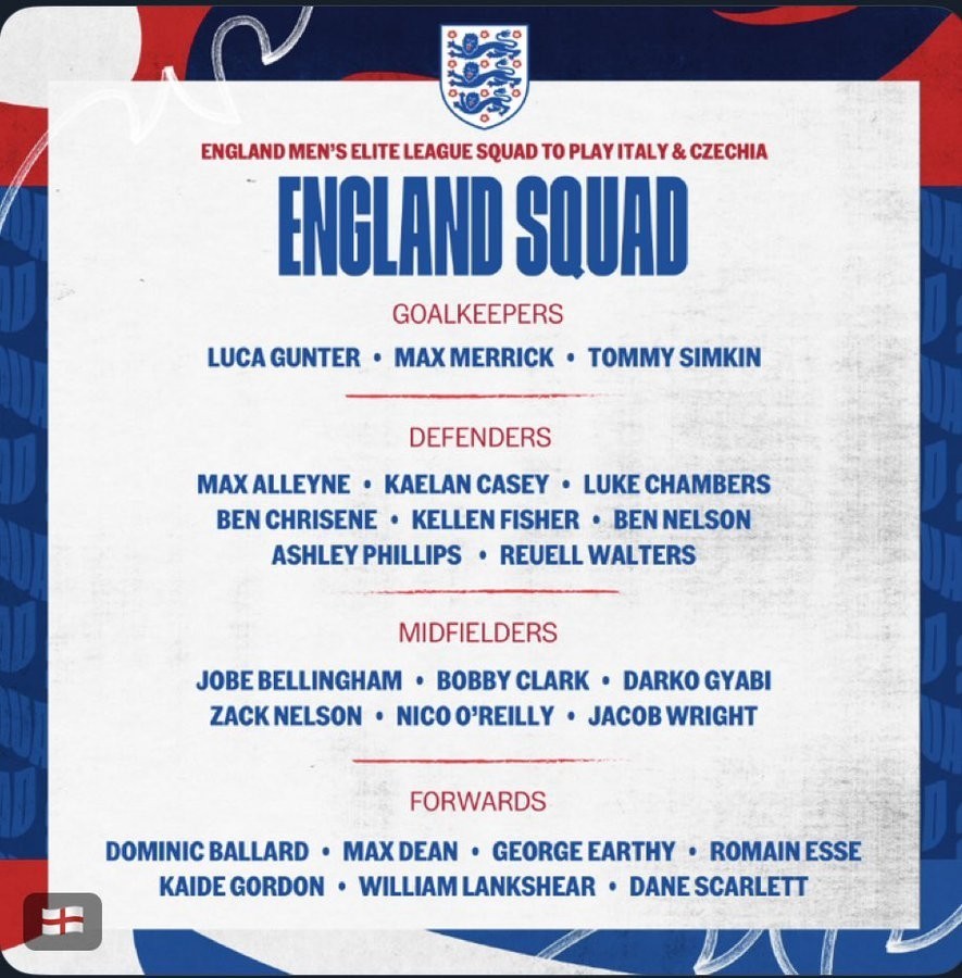 中场:乔布-贝林厄姆(桑德兰)、博比-克拉克(萨尔茨堡红牛)、格亚比(普利茅斯)、扎克-纳尔逊(卢顿)、尼科-奥赖利(曼城)、雅各布-赖特(曼城)。