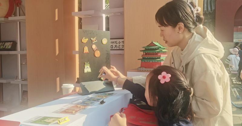 值得一提的是,文化市集旁的钟鼓楼文创品展销摊位前,游客们在抢购钟鼓楼系列冰箱贴。“这款以鼓楼为背景的冰箱贴,这前面的107路公交车造型是可以滑动的,承载着老北京人的青春记忆。”展销人员向游客介绍着。