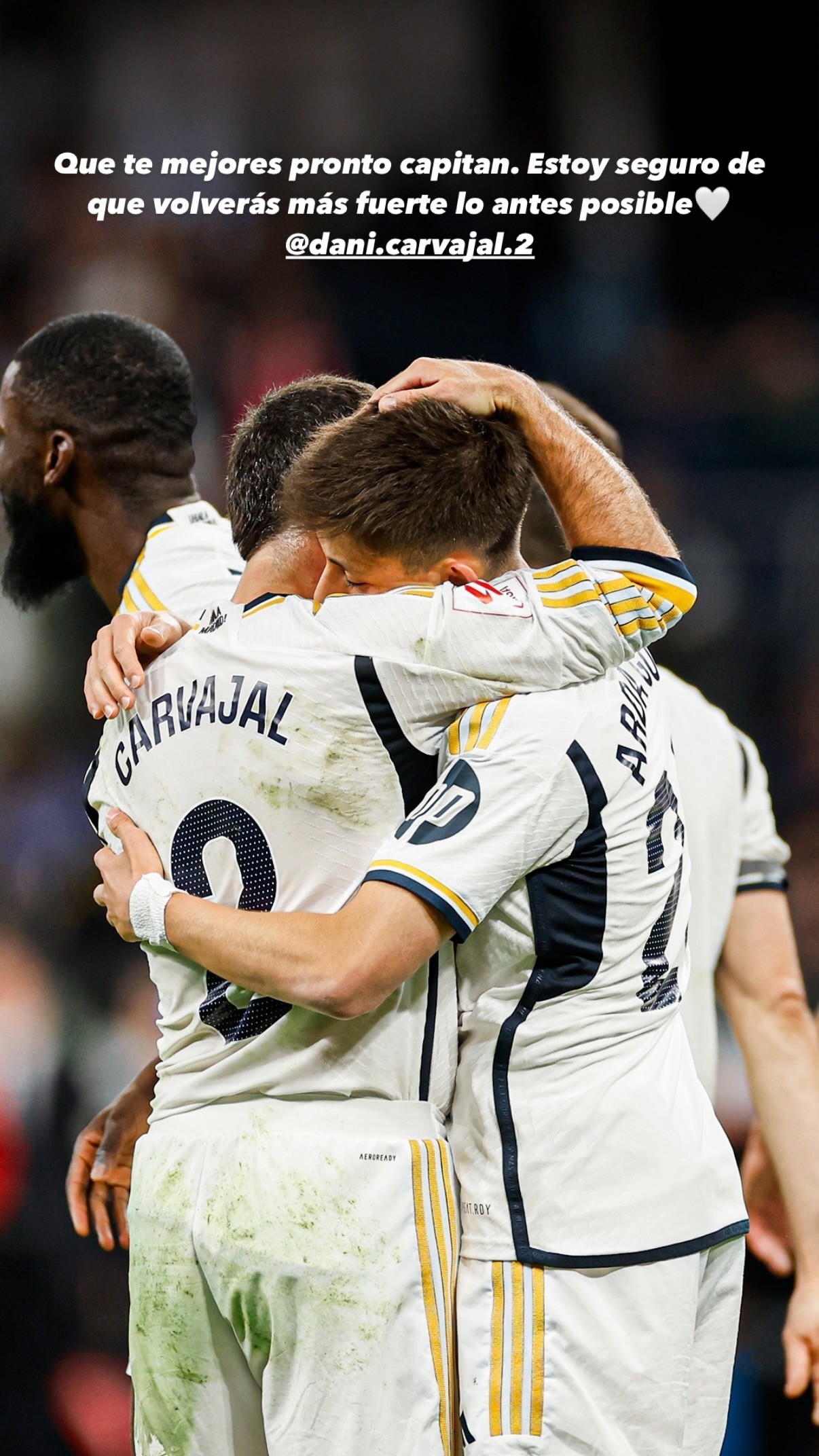 居莱尔在社交媒体晒出一张他和卡瓦哈尔拥抱的照片,并配文:“愿你早日康复,队长。我相信你会尽快以更强的姿态回归。”