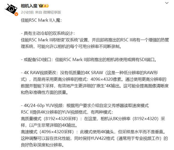 【CNMO科技消息】近日,CNMO注意到,佳能R5C Mark II相机的配置信息被曝光。这款新相机在多个方面进行了升级。