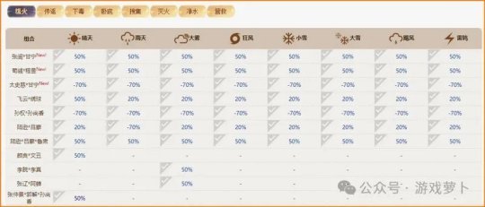 绣球+飞云:通过合击触发羁绊加成+20%,可以在晴天时卧底,雨天时纵火,或者通过下毒和卧底两种方式触发。