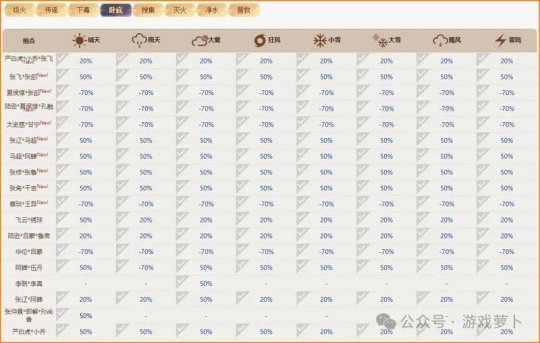鸢报羁绊就是指玩家使用有鸢报羁绊的角色进行突发事件任务时,有可能会获得增益。比如说颜良文丑可以获得百分之五十的增益。不过要达成增益需要根据突发事件的种类和天气决定,比如说纵火,下毒,天气,晴雨等不同天气,下面分享的是玩家总结的鸢报羁绊效果图:
