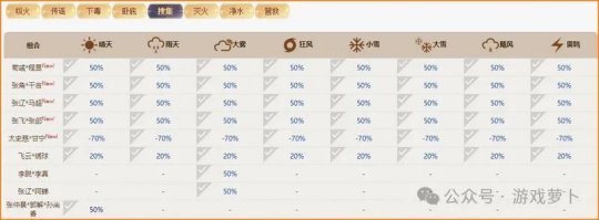郭嘉+贾诩:羁绊可以通过传谣(晴天、雾天、刮风、下雨)或下毒(晴天、雨天、刮风)两种方式触发。