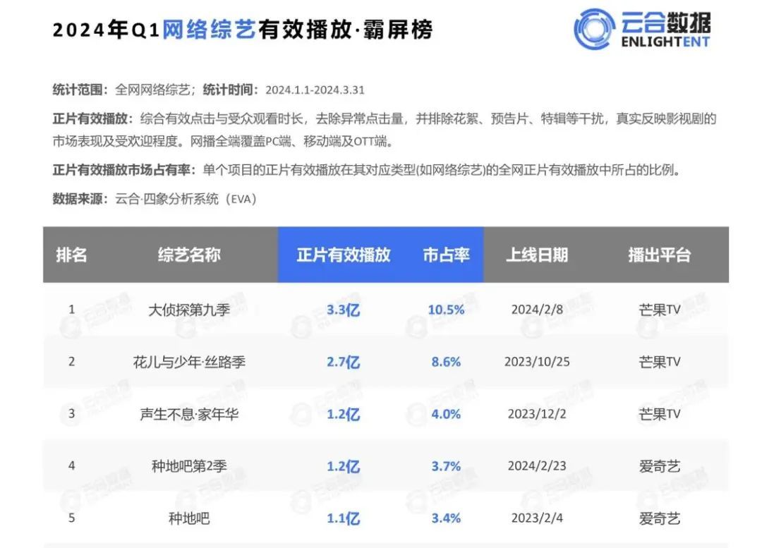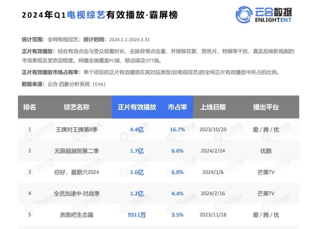根据云合2024Q1电视综艺有效播放榜单,占据前三的分别是《王牌对王牌第8季》《无限超越班2》《你好,星期六2024》,而网综top3被《大侦探第9季》《花儿与少年丝路季》《声生不息 嘉年华》占据。在这6档综艺中,《王牌》《你好星期六》IP一直以轻量的游戏环节为主要内容,《无限超越班》则聚焦于制造有争议性的艺人话题,《花儿与少年丝路季》则以群像、和谐的旅行氛围出圈。