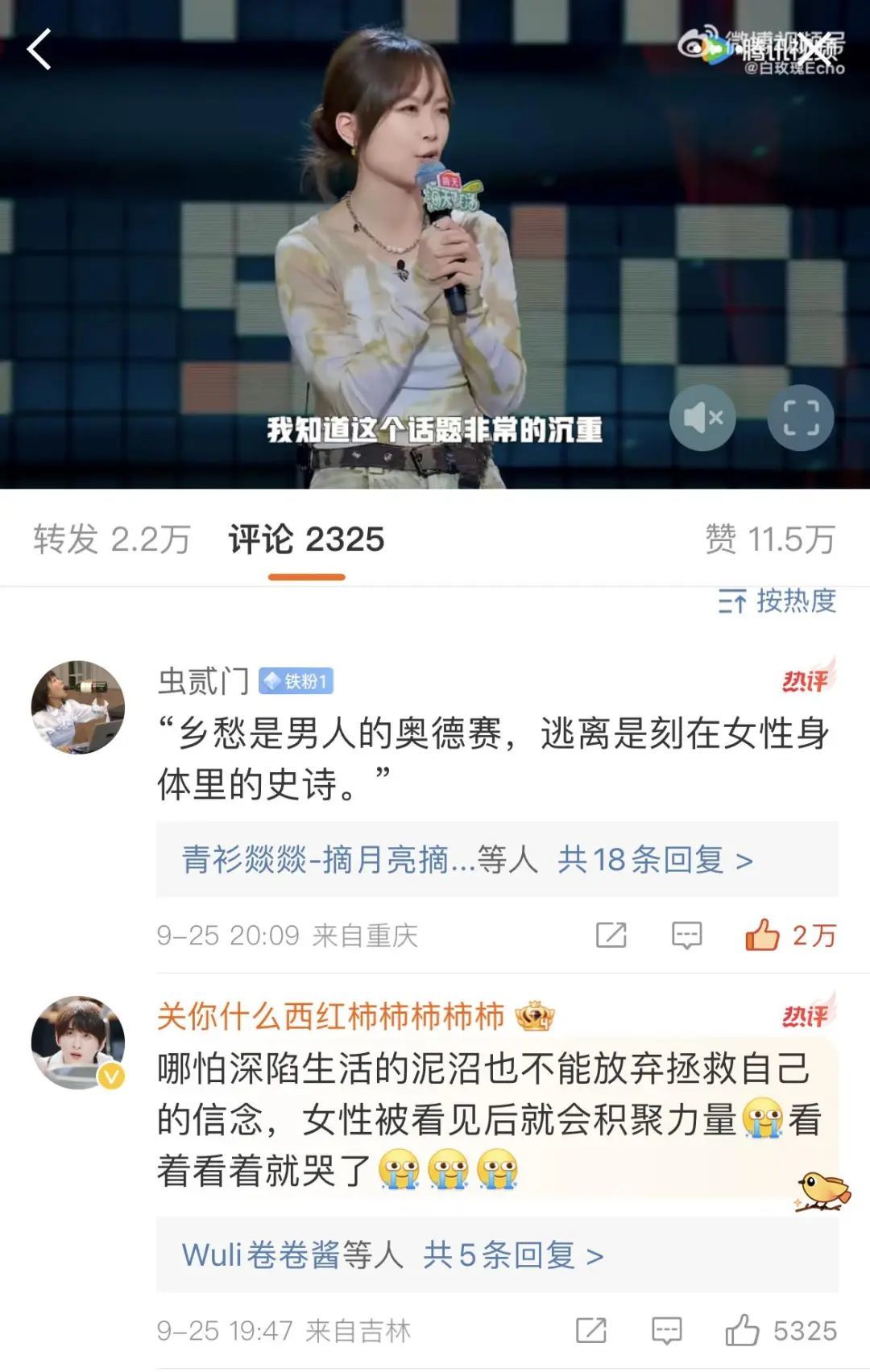 脱口秀演员Echo关于二姐出走的表演在社交媒体上引发了一波出圈热议,但与社媒上的反响不同,在录制当天,这个节目拿到了现场最低分,Echo也因此被淘汰。在赛后的采访中,演员也表示这个话题过于沉重,她很难处理得足够好。