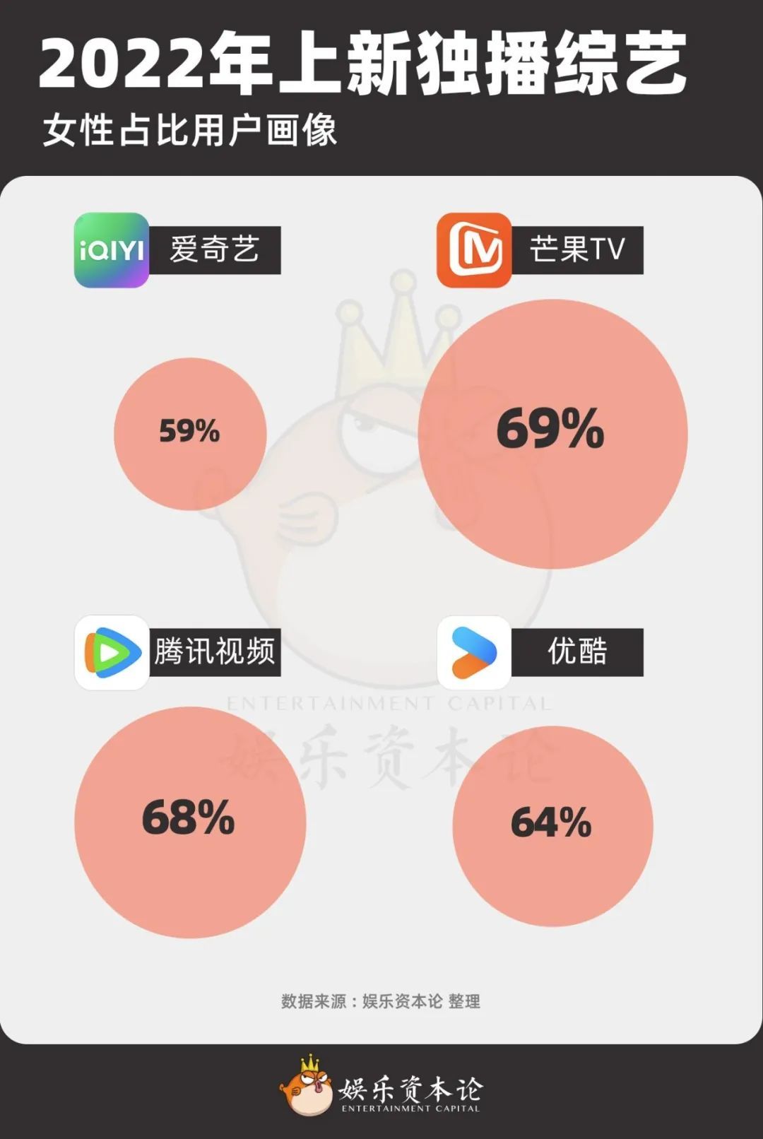 先看综艺受众的基本盘。根据云合数据发布的《2022年综艺网播表现及用户分析报告》,各平台独播综艺的观众平均年龄在27.3-27.6岁之间,其中女性用户占比在59%—69%之间。
