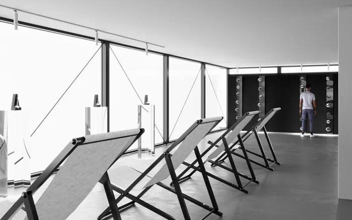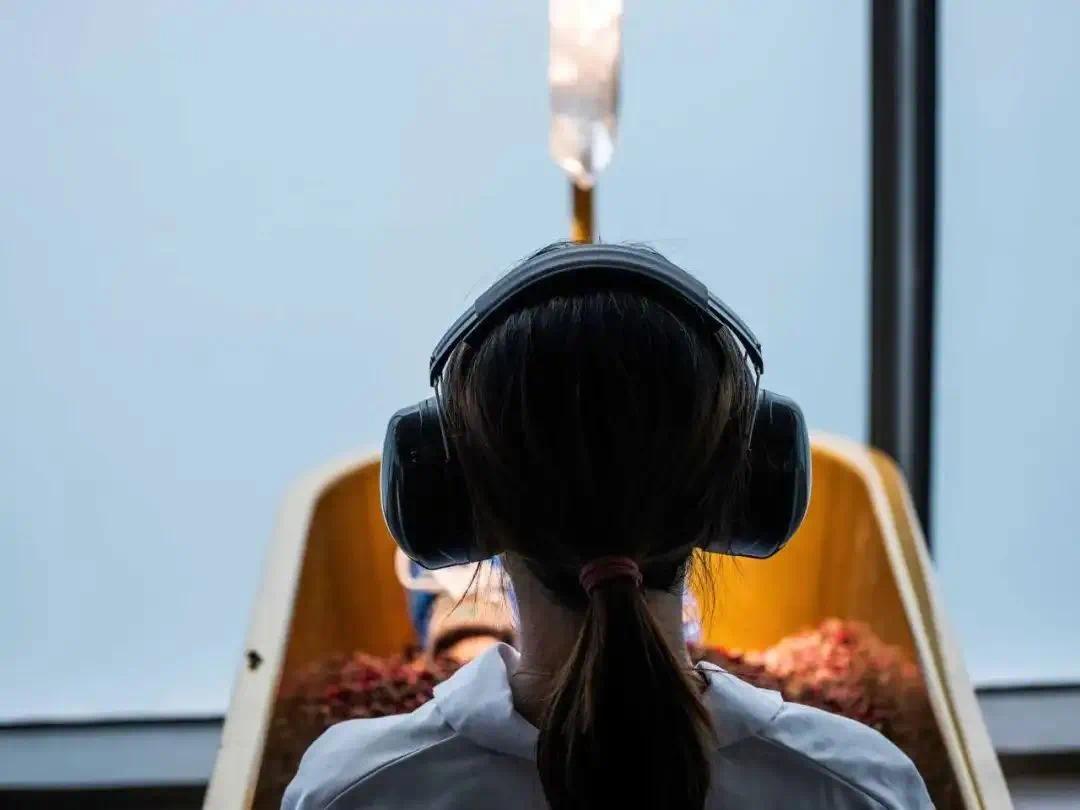 当参观者进入空间时,他们需要将个人物品如手表、手机和相机存放在储物柜中。然后,他们会佩戴降噪耳机,以进一步消除干扰。
