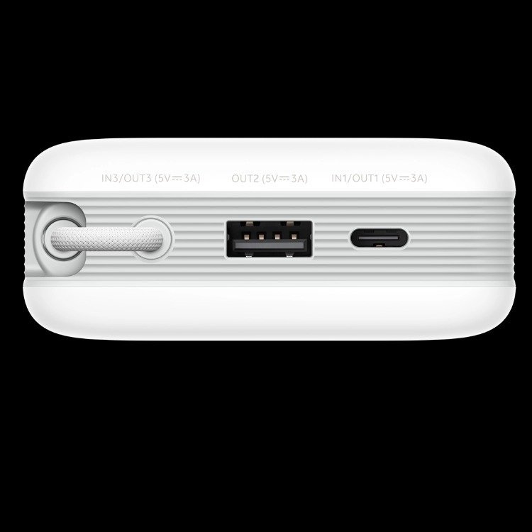 这两款移动电源的许多配置都很接近,比如都是 20000mAh 的大电池,并且都采用了自带线设计,并且也都有自带线+A 口+C 口的三重输出。这两款产品的外观设计也相当一致,都是白色的机身,并且侧面有纹理设计,自带线都是编织材质,看起来似乎只有快充能力有一些差异。