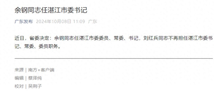 10月8日,据广东发布,近日,省委决定:余钢同志任湛江市委委员、常委、书记,刘红兵同志不再担任湛江市委书记、常委、委员职务。
