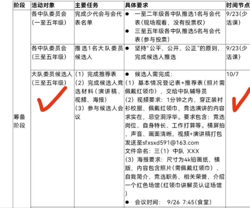 根据学校要求,每位候选人需要准备演讲稿、视频与海报等竞选材料。视频时长1分钟之内,候选人需穿正装衬衫校服,佩戴红领巾。视频要包含候选人岗位、自身特长、工作打算等内容。