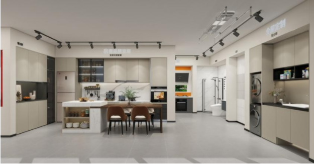 走进家庭帮门店,多产品板块排陈列井然有序:店内设置了宜居焕新、整家定制、卫浴改造,以及瓷砖地板材料与施工工法展示区,给用户带来“所见即所得”的直观消费体验;店内陈列着中燃宝、方太、美的等知名品牌,并提供到家清洁、家庭优选好物等多项产品与服务,俨然构筑成一个社区便民“服务站”。