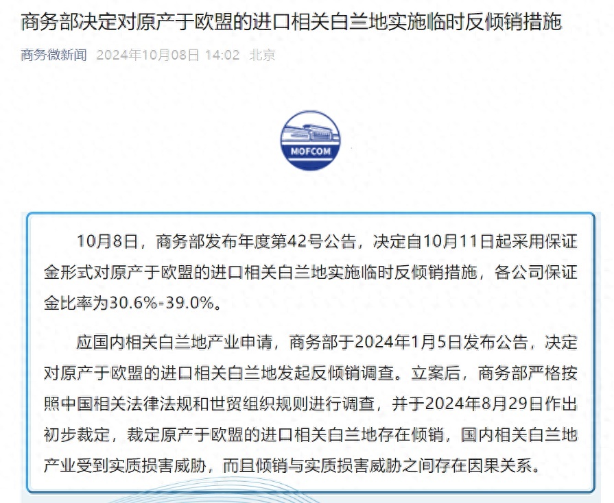 10月8日,商务部发布年度第42号公告,决定自10月11日起采用保证金形式对原产于欧盟的进口相关白兰地实施临时反倾销措施,各公司保证金比率为30.6%-39.0%。