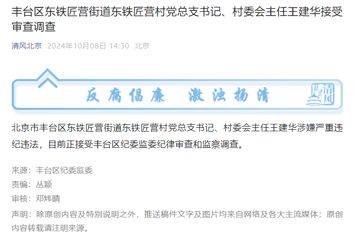 北京市丰台区东铁匠营街道东铁匠营村党总支书记、村委会主任王建华涉嫌严重违纪违法,目前正接受丰台区纪委监委纪律审查和监察调查。