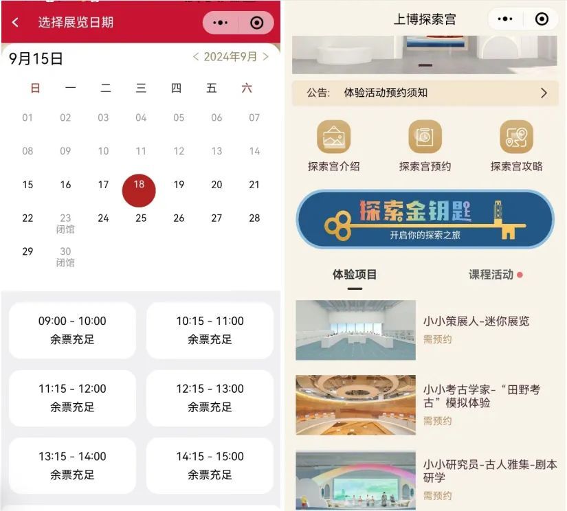 目前,热门的上海博物馆人民广场馆的所有参观都通过网络预约,白天预约分为7个时间段,供游客自行选择时间段预约。9月每逢周五、10月每逢周五、周六及国庆假期(10月1日至7日)期间,人民广场馆继续增设夜场,开放时间延长至晚上9点。每个时间段都设置一定的预约量,一旦预约量满了就自动停止预约。
