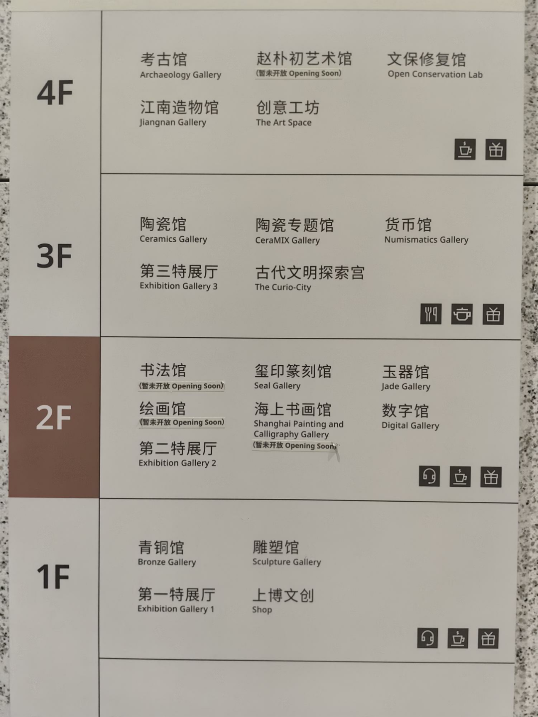 此外,上海博物馆东馆中庭连接一二三层的楼梯区集中设置了阶梯座位供观众休息。阶梯座位的另一侧平台是消费休息区,销售矿泉水、茶、果汁、咖啡、三明治、蛋糕、慕斯等各类饮品和食品,观众点单消费后,可以边品尝美食边放松休闲,休息后继续参观博物馆。