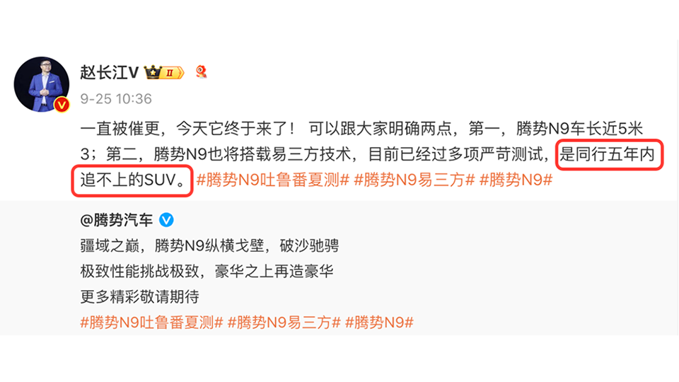 近日,腾势汽车官方发布一组腾势N9的实车伪装图,并宣布该车目前正在新疆吐鲁番进行测试。据扉旅汽车小编了解,该车的定位是一款大型SUV,主要的竞争对手包括理想L9、问界M9等。新车将会搭载Z9同款易三方技术,采用3电机驱动,预计将会在今年内上市。