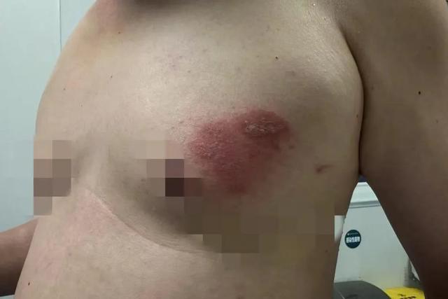 近日,长沙52岁的吴先生在感到左胸口一阵疼痛后,发现一只黑红相间的虫子,形似“大蚂蚁”,将其赶走后,皮肤迅速红肿且出现发脓渗水的情况,于是前往湖南省职业病防治院(南华大学附属职业病防治院)就诊。