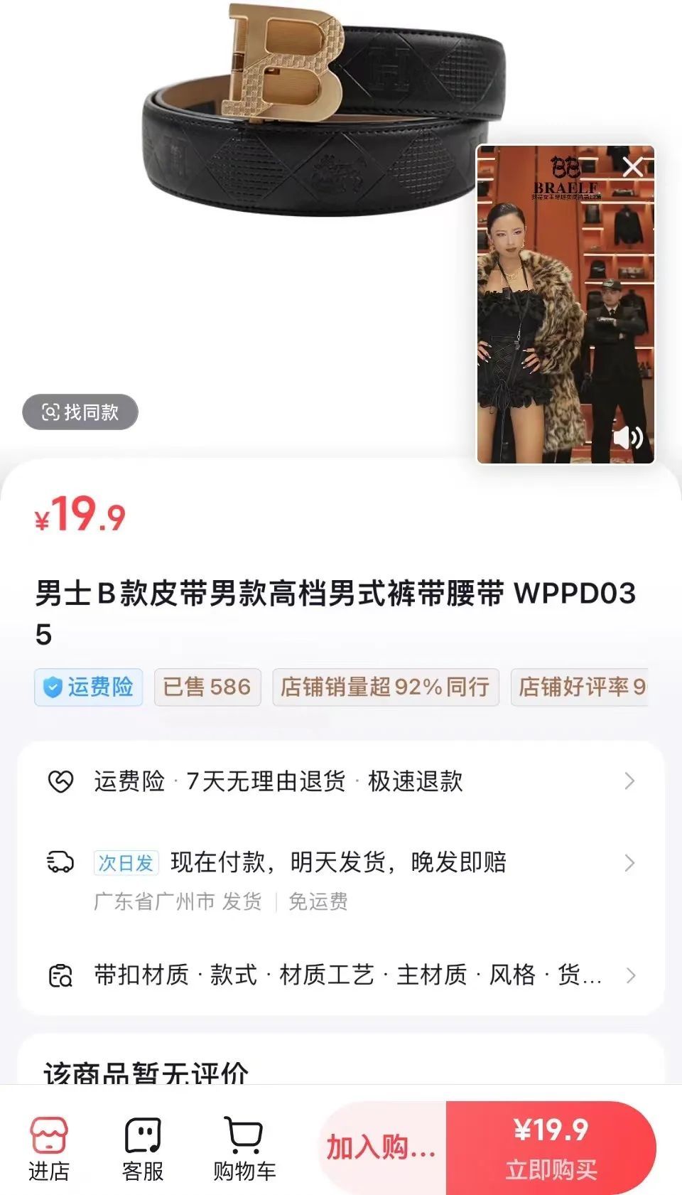 再来分析Coco姐直播间的商品,事实上,Coco姐直播间和豪情四姐直播间很多商品是完全重合的,其中就包括18.8元的男士“金腰带”内裤以及在奢侈品界暗指巴黎世家的BB(BRAELF或Billy Brown)短袖。