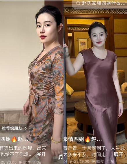 与澳门女大佬形成对比,另一位近期火起来的带货女大佬“豪情四姐”走的是内敛的“中式老钱”风格。