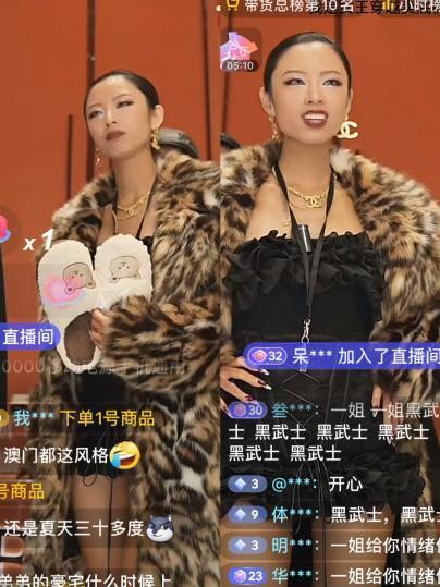 土豪貂皮大衣、精致烟熏妆容,主播口头禅为“拿50万出来玩”,主播身后站着一群男保镖,其中还不乏外国人,身后的直播间极具奢侈品风。