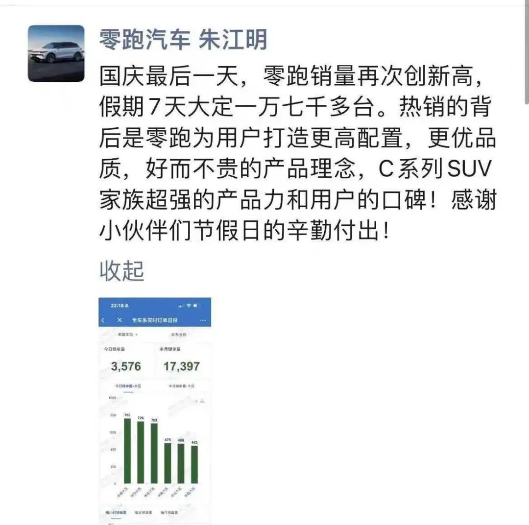 比如零跑汽车CEO朱江明,国庆假期还没过完,就迫不及待发战报,透露假期7天大定超1.7万台。