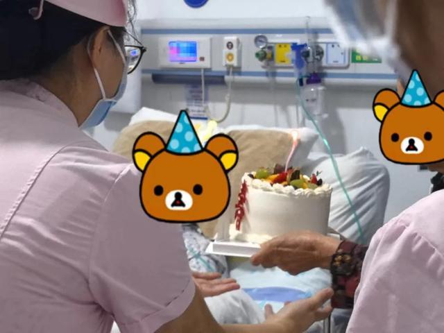 医护人员在病房为杨爷爷戴上金色生日帽,点燃蜡烛,并送上了真挚的祝福。