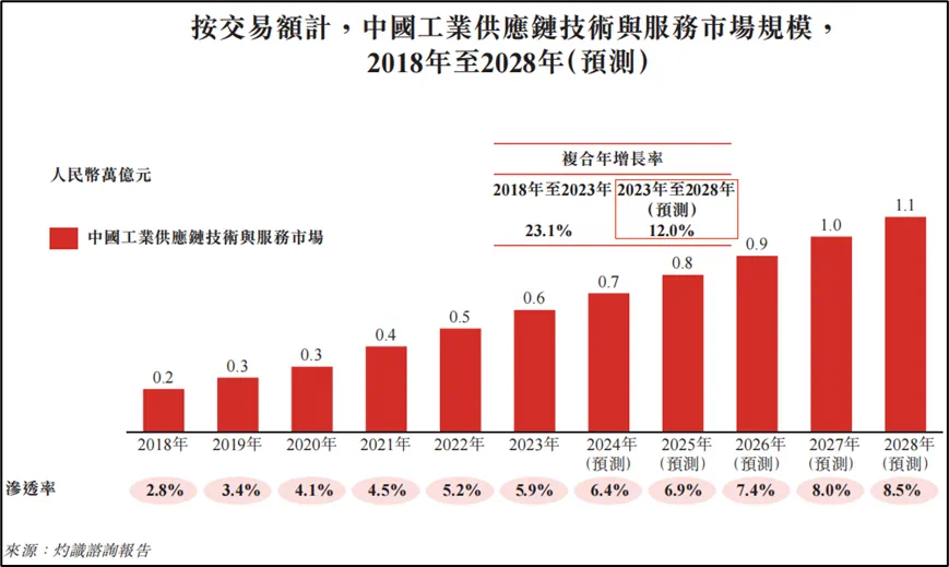 按交易额计,2023年中国供应链技术与服务市场规模为0.6万亿元,渗透率仅有5.9%;预计以12%的年复合增速增长至2028年的1.1万亿元,渗透率提升至8.5%。