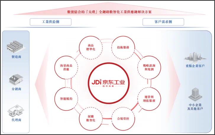 √商业模式:京东工业构建了端到端的供应链数智化基础设施,采用轻资产模式搭建高效且可拓展的业务,为各行业、各规模的客户提供跨场景、跨品类的全面工业品以及技术服务;在供需两端企业间的匹配与协同中,形成了全链路数智化工业供应链解决方案。