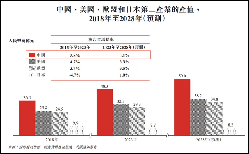 根据灼识咨询数据,中国第二产业产值由2018年的36.5万亿元增长至2023年的48.3万亿元,年复合增速为5.8%,并预计以4.1%的年复合增速增长至2028年的59万亿元。